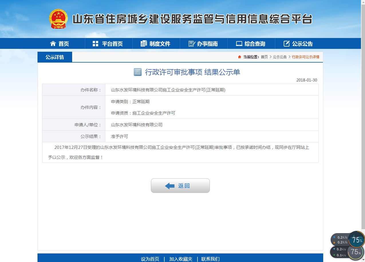 1月30日,山東省住房城鄉(xiāng)建設(shè)服務(wù)監(jiān)管與信用信息綜合平臺(tái)發(fā)布公示,山東水發(fā)環(huán)境科技有限公司成功獲得2018-2021年山東省施工企業(yè)安全生產(chǎn)許可,并于當(dāng)日進(jìn)行公示。