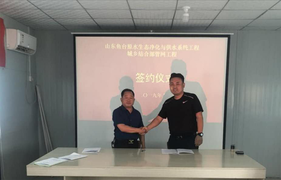 5月21日下午,山東魚臺原水生態(tài)凈化與供水系統(tǒng)工程城鄉(xiāng)結(jié)合部管網(wǎng)工程施工簽約儀式在魚臺縣順利舉行。水發(fā)金水建設(shè)工程有限公司總經(jīng)理蘇福貴、山東水發(fā)賢達(dá)水務(wù)有限公司總經(jīng)理潘愛國出席并簽訂了合同。
