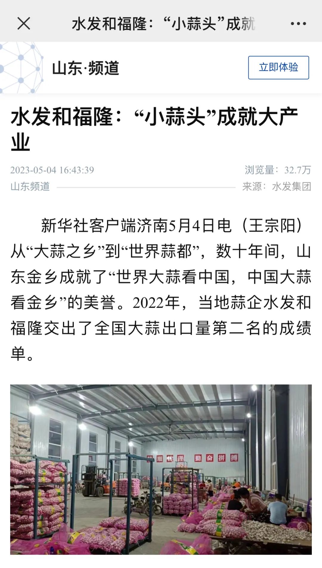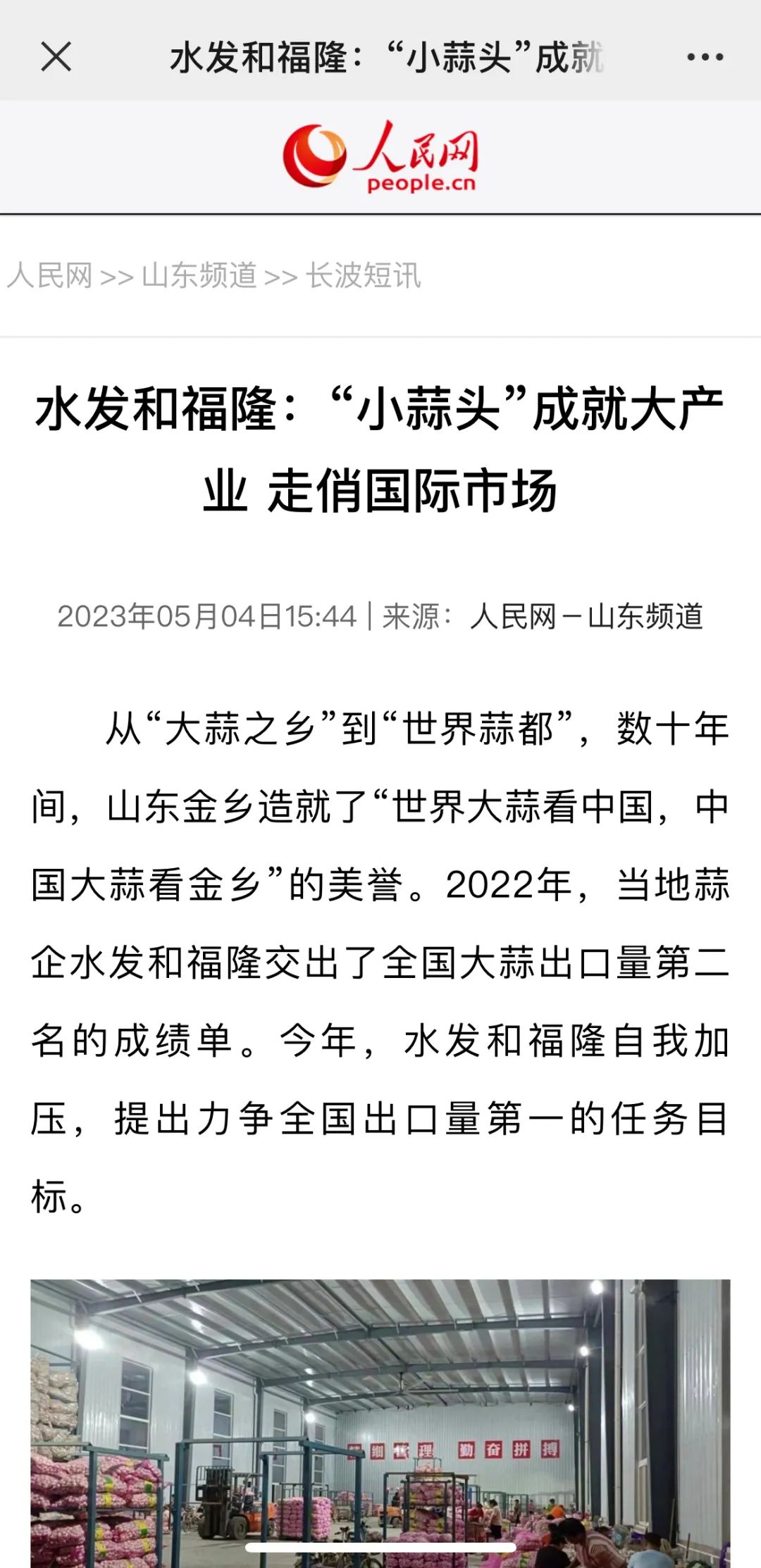 從“大蒜之鄉(xiāng)”到“世界蒜都”,數(shù)十年間,山東金鄉(xiāng)造就了“世界大蒜看中國,中國大蒜看金鄉(xiāng)”的美譽(yù)。2022年,當(dāng)?shù)厮馄笏l(fā)和福隆交出了全國大蒜出口量第二名的成績單。今年,水發(fā)和福隆自我加壓,提出力爭(zhēng)全國出口量第一的任務(wù)目標(biāo)。