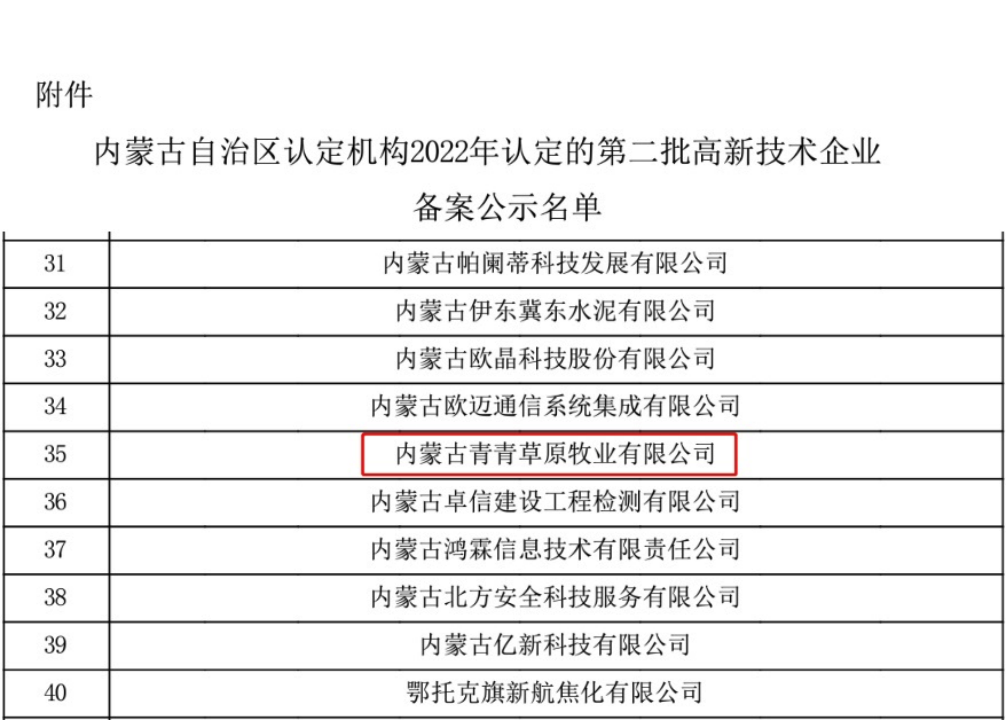 12月1日、12月14日,全國高新技術(shù)企業(yè)認(rèn)定管理工作領(lǐng)導(dǎo)小組辦公室分別公布了河南省2022年第一批高新技術(shù)企業(yè)備案通知和內(nèi)蒙古自治區(qū)2022年第二批高新技術(shù)企業(yè)備案通知,內(nèi)蒙古青青草原牧業(yè)有限公司及權(quán)屬子公司河南中羊牧業(yè)有限公司均成功入選。