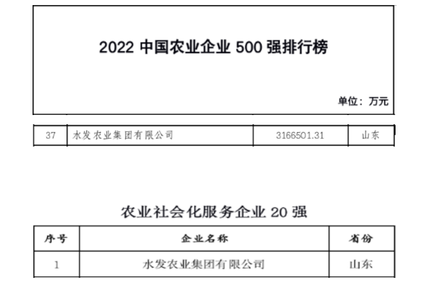 12月23日,“2022中國農(nóng)業(yè)企業(yè)500強”榜單正式發(fā)布,水發(fā)農(nóng)業(yè)集團有限公司(以下簡稱“水發(fā)農(nóng)業(yè)”)榮登“2022中國農(nóng)業(yè)企業(yè)500強”榜單,排名第37位,較去年上升46位。同時,水發(fā)農(nóng)業(yè)還入選了“農(nóng)業(yè)社會化服務企業(yè)20強”榜單,排名第1位。