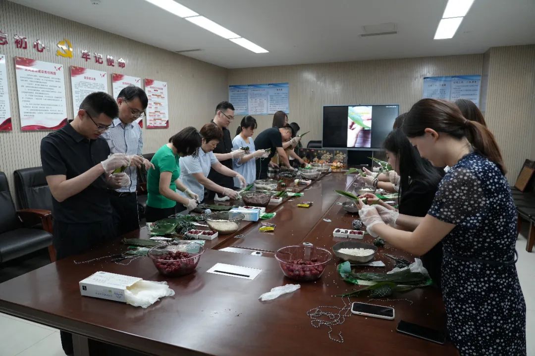 活動現(xiàn)場,工作人員精心準(zhǔn)備了活動需要的粽葉、糯米、大棗、繩子、豆沙餡等材料。水發(fā)農(nóng)業(yè)黨委書記、董事長吳東振,紀(jì)委書記張冬梅與機(jī)關(guān)各部室20余名員工齊動手,同參與,填糯米、放紅棗、裹葉子,邊包粽子,邊分享交流,濃濃的粽香味彌漫了整個活動場地,現(xiàn)場洋溢著歡聲笑語,其樂融融。