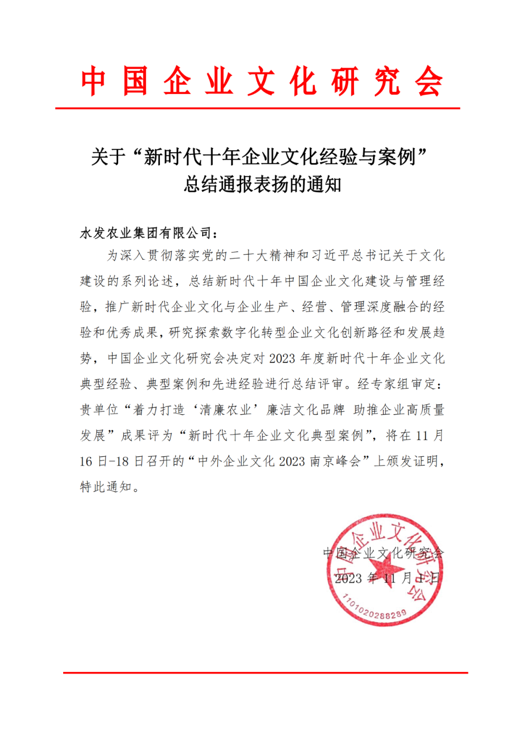 近日,經(jīng)中國(guó)企業(yè)文化研究會(huì)專家組審定,水發(fā)農(nóng)業(yè)集團(tuán)申報(bào)的《著力打造“清廉農(nóng)業(yè)”廉潔文化品牌助推企業(yè)高質(zhì)量發(fā)展》成果,被評(píng)為“新時(shí)代十年企業(yè)文化典型案例”并將在即將召開的“中外企業(yè)文化2023南京峰會(huì)”予以通報(bào)表揚(yáng)。